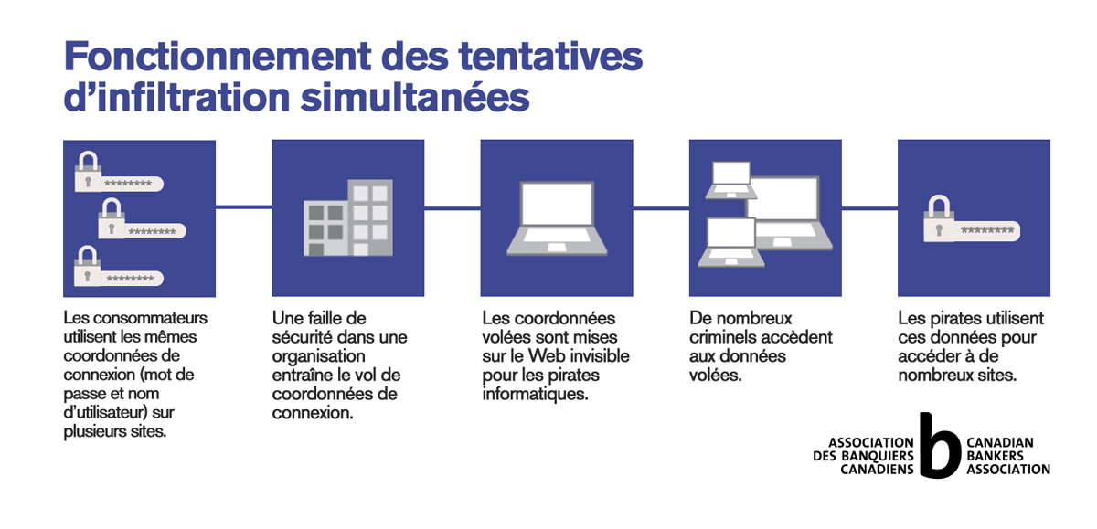 Ces criminels pourront utiliser la technique de tentatives d’infiltration simultanées, ou bourrage d’identifiants, où ils téléchargeront ces données dans un programme informatique pour tenter de se connecter simultanément à de nombreux autres sites, dont votre compte en banque. Et si vous utilisez les mêmes coordonnées de connexion pour plusieurs sites Web, les criminels auront en main un passe‑partout à tous vos comptes.