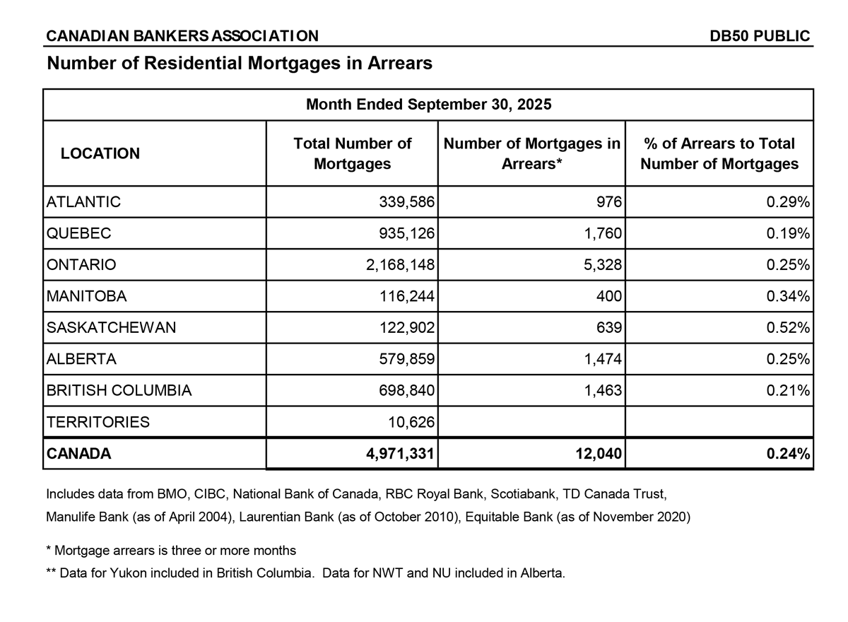 As of September 2025, the most recent statistics available, the national arrears rate was 0.24%, which means that less than a quarter of a percentage point of mortgages are in arrears. This is well below levels in the United States and the United Kingdom. While arrears rates in Canada have edged upward in recent months, they are still close to historic lows.