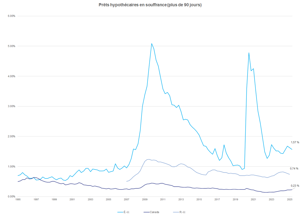 Selon les chiffres de juillet 2025, soit les plus récentes statistiques sur les prêts hypothécaires, le taux national des prêts hypothécaires en souffrance se place à 0,23 % ou à moins d’un quart de point de pourcentage. Ce taux est de loin inférieur aux taux constatés aux États‑Unis et au Royaume‑Uni. Malgré une légère hausse récente, le taux des prêts en souffrance au Canada est toujours proche des faibles records historiques.